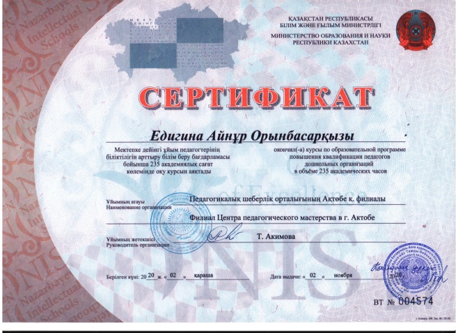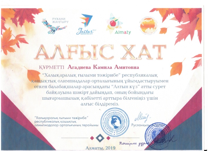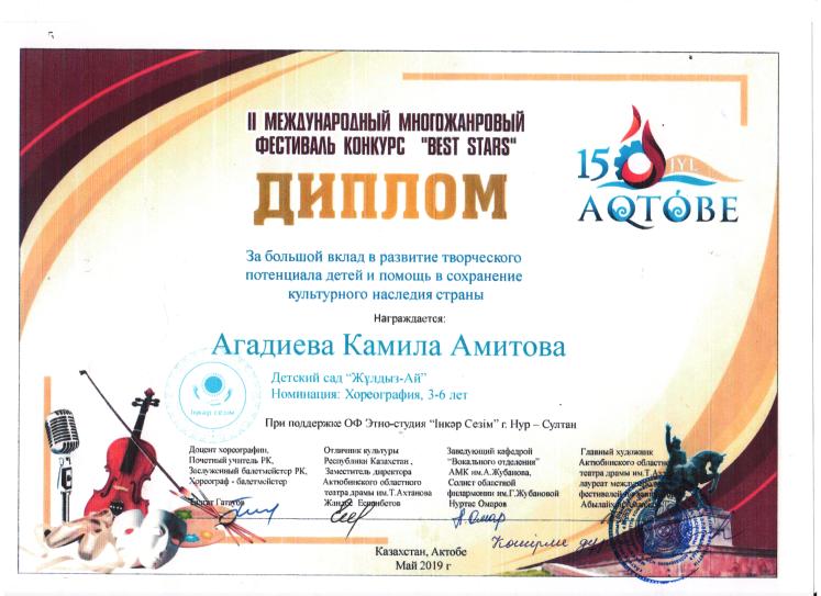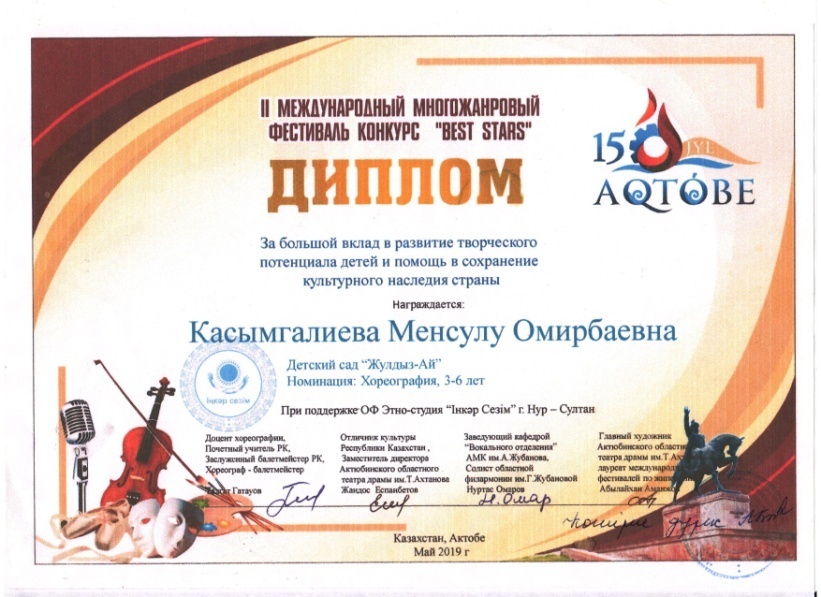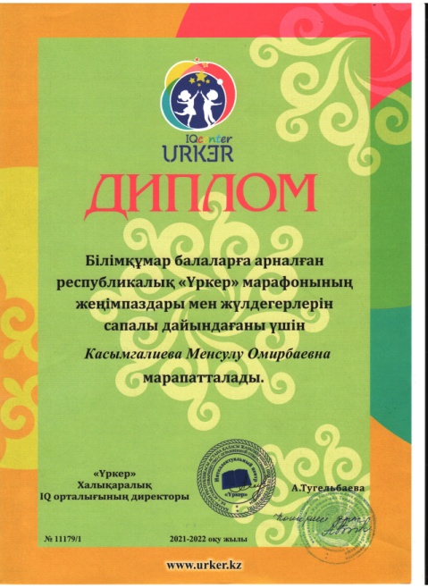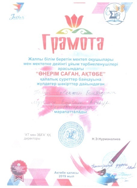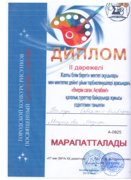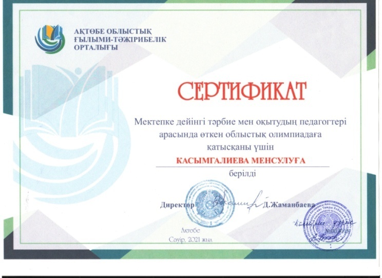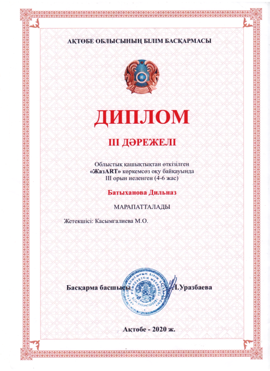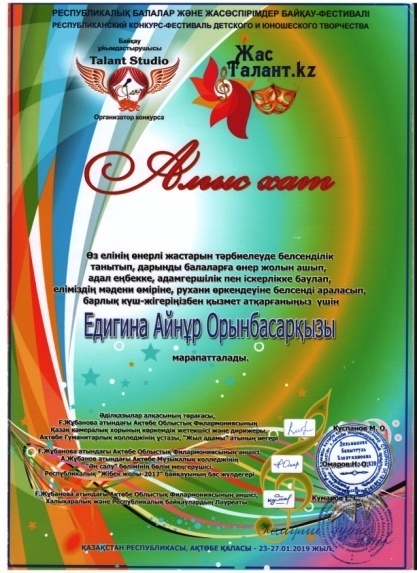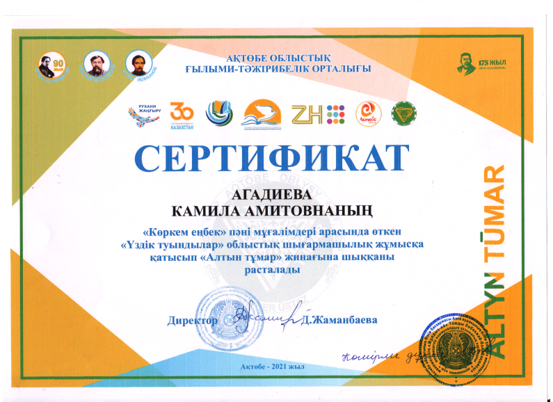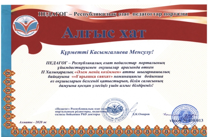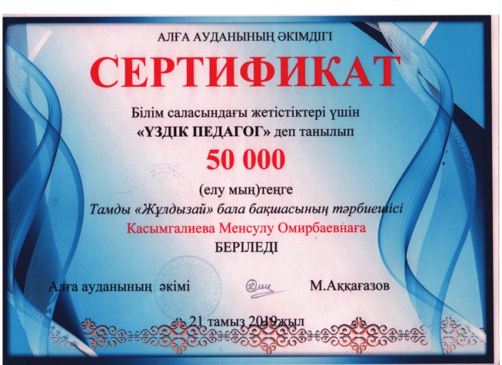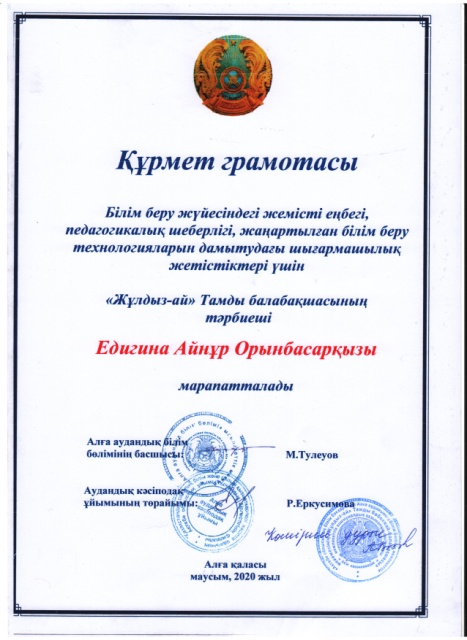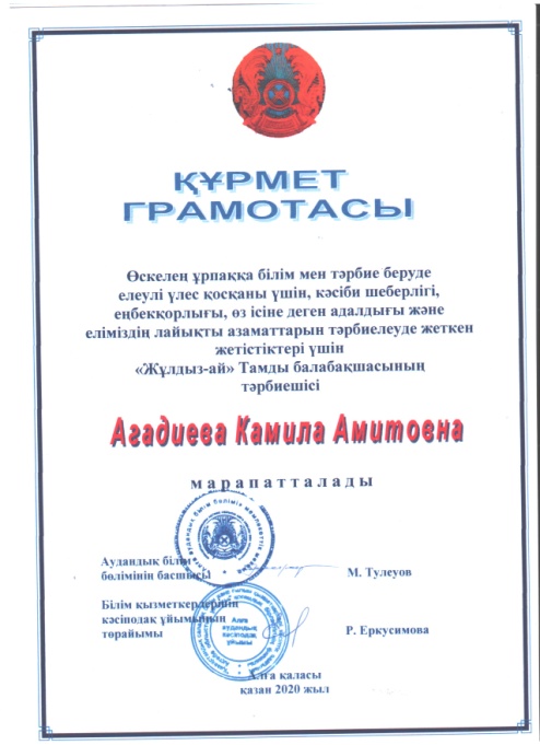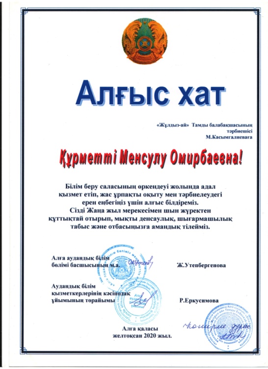 Ұстаздар күні мерекесіне орай «Жұлдыз-ай» Тамды бөбекжай- балабақшасының тәрбиешісі М.О.Касымгалиева «Қазақстандық салалық білім және ғылым қызметкерлері кәсіптік одағының Ақтөбе облыстық ұйымы» қоғамдық бірлестігінің атынан Құрмет грамотасымен марапаттал