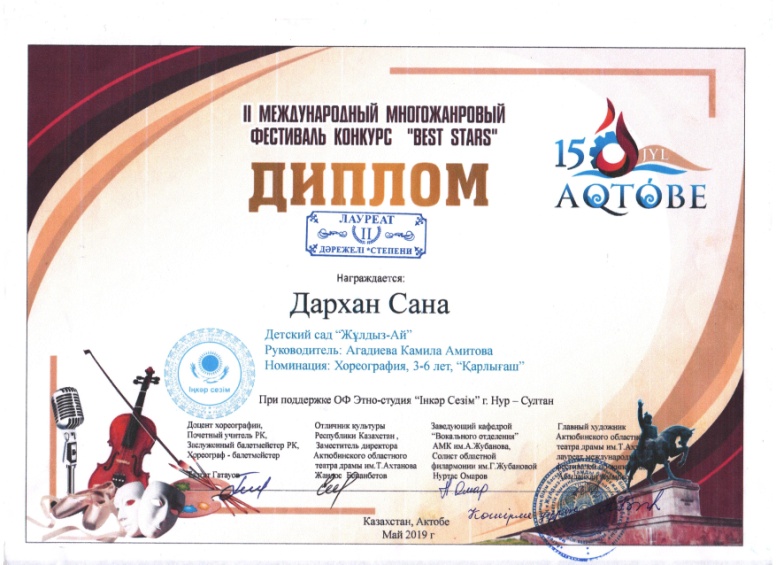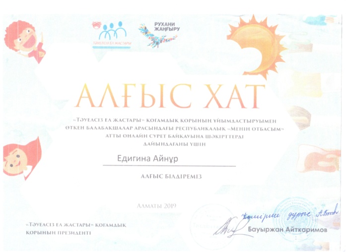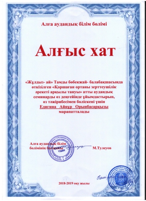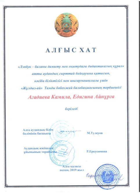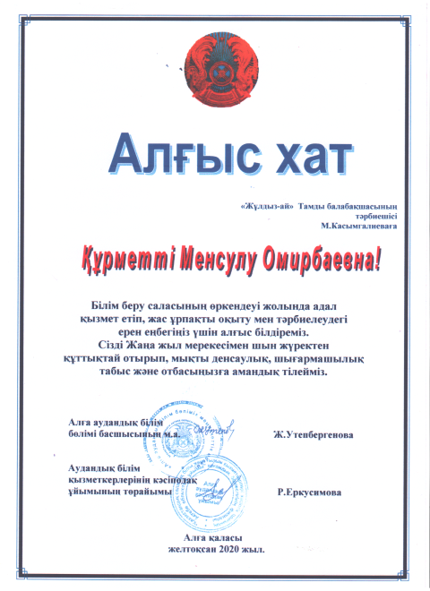 бөбекжай- балабақшасы Алғыс хатпен марапатталды