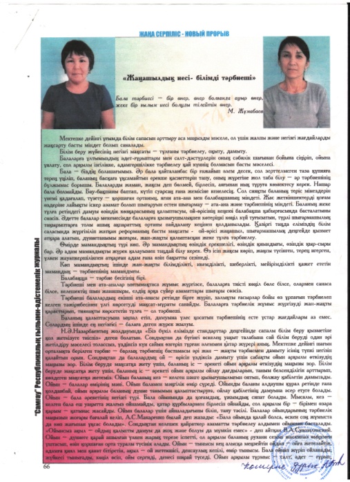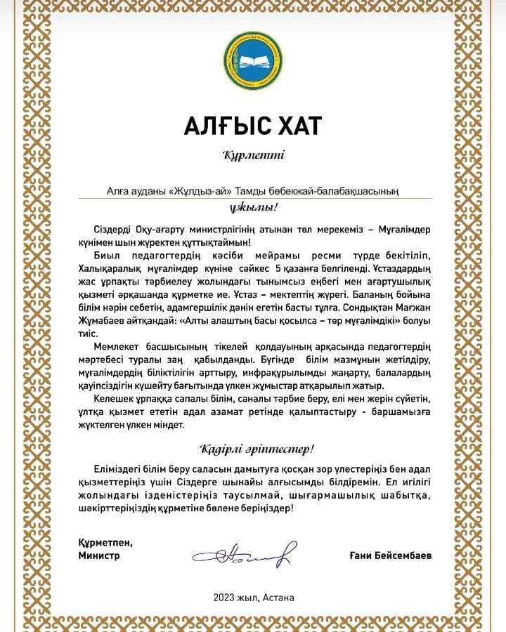 «Жұлдыз- ай» Тамды бөбекжай- балабақшасының ұжымын Оқу-ағарту министрі Ғани Бейсенбаевтан ұстаздардың төл мерекесіне орай алғыс хат берілді. Ел игілігі жолындағы ұстаздарға шығармашылық табыс тіледі.