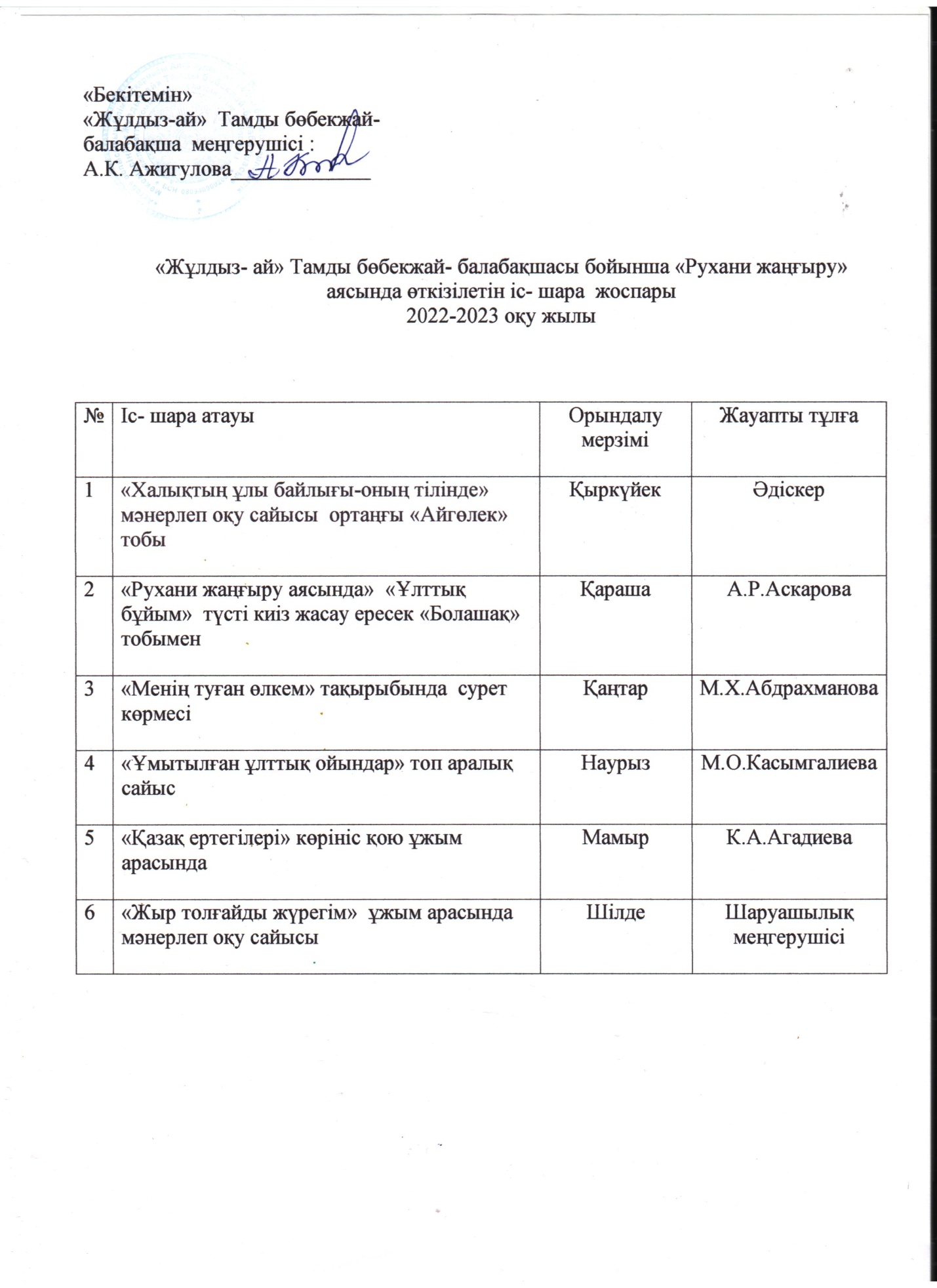 28.11.2022 жыл. Рукхани жаңғыру жоспарына сәйкес ересек «Болашақ» тобының тәрбиеленушілерімен «Ұлттық бұйым» тақырыбында ойын өткізілді. Өткізген педагог- психолог: Аскарова А.Р. 28.03.2023 жыл. Рукхани жаңғыру жоспарына сәйкес ортаңғы «Айгөлек» тобының тәрбиеленушілерімен «Ұмытылған ұлттық ойындар» тақырыбында ойын өткізілді. Тәрбиешісі: Касымгалиева М.О.