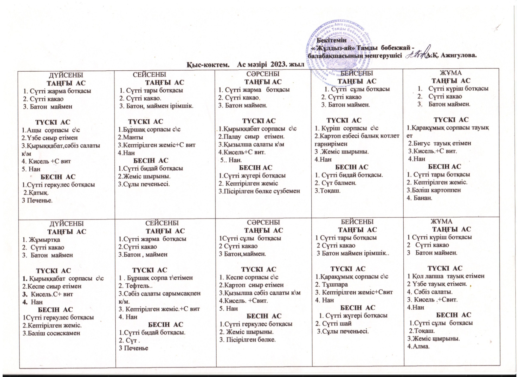 21.09.2023 жыл. «Жұлдыз- ай» Тамды бөбекжай- балабақшасында бракеражды комиссия құрамы тамақтану сапасына мониторинг жүргізді. Мониторинг барысында: